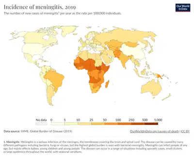 About 10% of adults are carriers of the bacteria in their nasopharynx.[2] As an exclusively human pathogen, it is the main cause of bacterial meningitis in children and young adults, causing developmental impairment and death in about 10% of cases. It causes the only form of bacterial meningitis known to occur epidemically, mainly in Africa and Asia. It occurs worldwide in both epidemic and endemic form.[3]