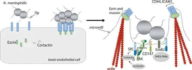 - ↑ Hill DJ, Griffiths NJ, Borodina E, Virji M (February 2010). "Cellular and molecular biology of Neisseria meningitidis colonization and invasive disease". Clinical Science. 118 (9): 547–64. doi:10.1042/CS20090513. PMC 2830671. PMID 20132098.