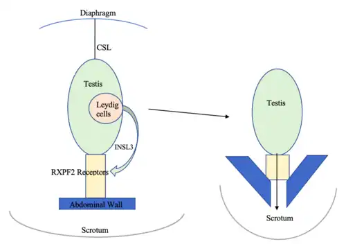 Insulin-Like Peptide 3 (INSL3) is produced by the interstitial Leydig cells located in the adult testes.[3] Leydig cells are responsible for steroidogenesis, the fetal Leydig cells differentiate during the development of the embryo.[3] They produce necessary androgens for the masculinisation of organs.[3] They also produce INSL3, which is required for the first transabdominal phase of testicular descent.[3] INSL3 acts on RXFP2 receptors which link the testis to the inguinal abdominal wall. As a result, the testes move from the inguinal canal into the scrotum.[3] Only mammals have a scrotum and descended testes.[3] INSL3 measured in amniotic fluid can therefore be a biomarker for testis development, although this period differs between species.[6]