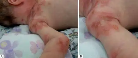 | HSV disease in a newborn child-a)Erythematous plaques presenting vesicle areas b) vesicles submitted to cytological exam | |
