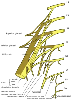 Ventral rami of L4–S3 with parts of L4 and S4 spinal nerves form the sacral plexus. It is located on the posterior wall of pelvic cavity (pelvis minor). Nervi of the plexus innervate the perineal region, buttocks and the lower limb. The largest nerve of the human body, the sciatic nerve, is the main branch that gives rami to the motor innervation of the muscles of the thigh, the leg, and the foot. Common peroneal nerve and its branches innervate some parts of the skin of the foot, the peroneal muscles of the leg, and the dorsal muscles of the foot.