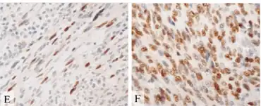 e,f) Malignant peripheral nerve sheath tumor immunoreactive for p53