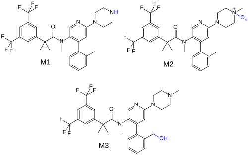 The substance is mainly metabolized by CYP3A4, and to a lesser extent by CYP2D6 and CYP2C9. The main metabolites are desmethyl-netupitant (M1), netupitant N-oxide (M2), and hydroxy-netupitant (M3); all three are pharmacologically active.[3][8]