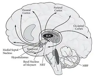 Relatively local bilateral injuries to midline (paramedian) subcortical structures can also cause a complete loss of awareness.[31] These structures therefore enable and control brain arousal (as determined by metabolic or electrical activity) and are necessary neural correlates. One such example is the heterogeneous collection of more than two dozen nuclei on each side of the upper brainstem (pons, midbrain and in the posterior hypothalamus), collectively referred to as the reticular activating system (RAS). Their axons project widely throughout the brain. These nuclei – three-dimensional collections of neurons with their own cyto-architecture and neurochemical identity – release distinct neuromodulators such as acetylcholine, noradrenaline/norepinephrine, serotonin, histamine and orexin/hypocretin to control the excitability of the thalamus and forebrain, mediating alternation between wakefulness and sleep as well as general level of behavioral and brain arousal. After such trauma, however, eventually the excitability of the thalamus and forebrain can recover and consciousness can return.[32] Another enabling factor for consciousness are the five or more intralaminar nuclei (ILN) of the thalamus. These receive input from many brainstem nuclei and project strongly, directly to the basal ganglia and, in a more distributed manner, into layer I of much of the neocortex. Comparatively small (1 cm3 or less) bilateral lesions in the thalamic ILN completely knock out all awareness.[33]