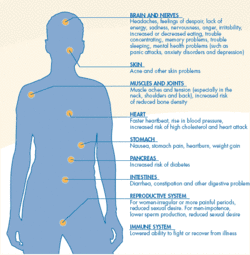 Prolonged stress leads to many hazards within the nervous system. Various hormones and glands become overworked, and chemical waste is produced, resulting in the degeneration of nerve cells. The result of prolonged stress is the breakdown of the body and the nervous system. Stress alone does not produce potentially deadly arrhythmias in normal healthy hearts; however, studies do appear to show that stress causes cardiac damage that may lead to arrhythmias.