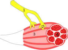 Neuromuscular junction. 1. Axon innervating muscle fibers; 2. Junction between axon and muscle fiber; 3. Muscle; 4. Muscle fiber