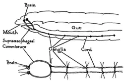 The vast majority of existing animals are bilaterians, meaning animals with left and right sides that are approximate mirror images of each other. All bilateria are thought to have descended from a common wormlike ancestor that appear as fossils beginning in the Ediacaran period, 550–600 million years ago.[11] The fundamental bilaterian body form is a tube with a hollow gut cavity running from mouth to anus, and a nerve cord with an enlargement (a "ganglion") for each body segment, with an especially large ganglion at the front, called the "brain".