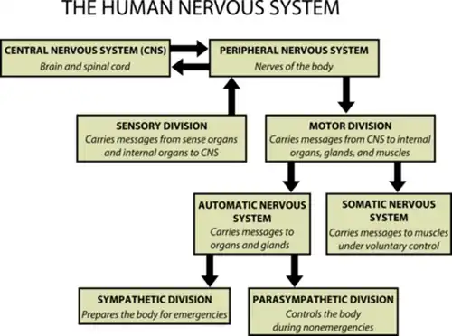 In biology, the nervous system is the highly complex part of an animal that coordinates its actions and sensory information by transmitting signals to and from different parts of its body. The nervous system detects environmental changes that impact the body, then works in tandem with the endocrine system to respond to such events.[1] Nervous tissue first arose in wormlike organisms about 550 to 600 million years ago. In vertebrates, it consists of two main parts, the central nervous system (CNS) and the peripheral nervous system (PNS). The CNS consists of the brain and spinal cord. The PNS consists mainly of nerves, which are enclosed bundles of the long fibers, or axons, that connect the CNS to every other part of the body. Nerves that transmit signals from the brain are called motor nerves (efferent), while those nerves that transmit information from the body to the CNS are called sensory nerves (afferent). The PNS is divided into two separate subsystems, the somatic and autonomic nervous systems. The autonomic nervous system is further subdivided into the sympathetic, parasympathetic and enteric nervous systems. The sympathetic nervous system is activated in cases of emergencies to mobilize energy, while the parasympathetic nervous system is activated when organisms are in a relaxed state. The enteric nervous system functions to control the gastrointestinal system. Nerves that exit from the brain are called cranial nerves while those exiting from the spinal cord are called spinal nerves.