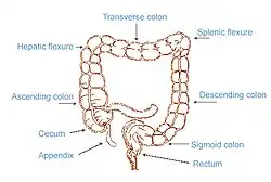 The gastrointestinal tract (GI tract) has a complex control mechanism that relies on coordinated interaction between muscular contractions and neuronal impulses (nerve signals).[3] Fecal incontinence or constipation occurs when there is a problem with normal bowel functioning. This could be for a variety of reasons. The normal defecation pathway involves contractions of the colon which helps mix the contents, absorb water and propel the contents along. This results in feces moving along the colon to the rectum.[4] The presence of stool in the rectum causes reflexive relaxation of the internal anal sphincter (rectoanal inhibitory reflex), so the contents of the rectum can move into the anal canal. This causes the conscious feeling of the need to defecate. At a suitable time the brain can send signals causing the external anal sphincter and puborectalis muscle to relax as these are under voluntary control and this allows defecation to take place.[4][5]