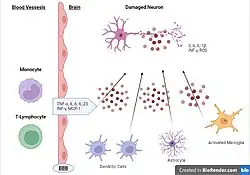 Cytokines are a class of proteins regulating inflammation, cell signaling, and various cell processes such as growth and survival.[10] Chemokines are a subset of cytokines that regulate cell migration, such as attracting immune cells to a site of infection or injury.[10] Various cell types in the brain may produce cytokines and chemokines such as microglia, astrocytes, endothelial cells, and other glial cells. Physiologically, chemokines and cytokines function as neuromodulators that regulate inflammation and development. In the healthy brain, cells secrete cytokines to produce a local inflammatory environment to recruit microglia and clear the infection or injury. However, in neuroinflammation, cells may have sustained release of cytokines and chemokines which may compromise the blood–brain barrier.[11] Peripheral immune cells are called to the site of injury via these cytokines and may now migrate across the compromised blood brain barrier into the brain. Common cytokines produced in response to brain injury include: interleukin-6 (IL-6), which is produced during astrogliosis, and interleukin-1 beta (IL-1β) and tumor necrosis factor alpha (TNF-α), which can induce neuronal cytotoxicity. Although the pro-inflammatory cytokines may cause cell death and secondary tissue damage, they are necessary to repair the damaged tissue.[12] For example, TNF-α causes neurotoxicity at early stages of neuroinflammation, but contributes to tissue growth at later stages of inflammation.