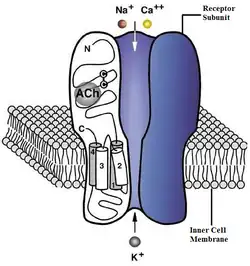 Depolarizing neuromuscular blockers: Depolarizing agents act as agonists for acetylcholine receptors. Succinylcholine is currently the only depolarizing neuromuscular blocking drug that has been placed in ongoing clinical use. Its pharmacological structure resembles two acetylcholine molecules combined through acetate methyl groups.[11] It contains two quaternary ammonium radicals which associate with the two alpha subunits of the nicotinic receptor to cause depolarization.[12] These nicotinic receptors respond to acetylcholine and are located in the central and peripheral nervous system, muscle, and other tissue. They act as the primary receptor in muscle for motor nerve-muscle communication which signals muscle contractions.[13]