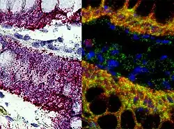 An example of the application of this technique in neuroscience is the immunolabeling of antigens like NGF-Inducible Large External glycoprotein (NILE-GF), choline acetyltransferase, parvalbumin, and neurofilament protein.[15] All of these antigens are present in specific neuronal cell types. With these we can define anatomical circuits with a high degree of resolution, and understand the role of some proteins and cells in the nervous system, as well as the location of that same proteins and cells.