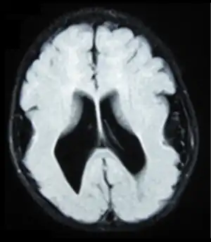 | Brain MRI, T1 weighted on a transversal plane, of an 8-month old boy with lissencephaly. Note the scarce and wide gyri, mostly on the parietal, temporal and occipital lobes, the absence of a true Sylvian fissure, and the augmented thickness of the gray matter. The boy had a severe developmental delay and seizures. | |