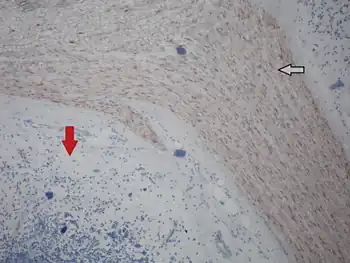 Microscopy of nerve sheath myxoma, red arrow indicates the tumoral tissue