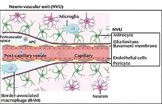 - 1 2 3 4 5 Stanimirovic DB, Friedman A (July 2012). "Pathophysiology of the neurovascular unit: disease cause or consequence?". Journal of Cerebral Blood Flow and Metabolism. 32 (7): 1207–1221. doi:10.1038/jcbfm.2012.25. PMC 3390807. PMID 22395208.