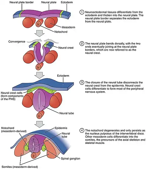 The process begins when the notochord induces the formation of the central nervous system (CNS) by signaling the ectoderm germ layer above it to form the thick and flat neural plate. The neural plate folds in upon itself to form the neural tube, which will later differentiate into the spinal cord and the brain, eventually forming the central nervous system.[2] Computer simulations found that cell wedging and differential proliferation are sufficient for mammalian neurulation.[3]