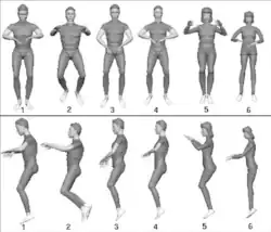 Later work by NASA based on research aboard Space Shuttle mission STS-57 found greater individual variations between crew members' neutral body positions than originally suggested by the earlier Skylab study.[4] In general, three main postures were exhibited by the crew as a whole. These constituted (1) an almost standing posture, (2) a slightly pitched forward posture with an extreme bend at the knees, and (3) an elongated posture with a straight neck. Differences in posture exhibited in this study could be a result of the athletic bearing of the participants or the type of exercise, or both, and the amount of exercise regularly performed. Other differences may also stem from past physical injuries such as bone breaks and knee or shoulder injuries, and from gender differences such as center of gravity.[4] No single crew member exhibited the typical NBP called out in the MSIS standard.[4]