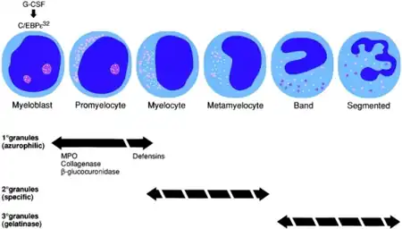 - ↑ Ganz T, Metcalf JA, Gallin JI, Boxer LA, Lehrer RI (1988). "Microbicidal/cytotoxic proteins of neutrophils are deficient in two disorders: Chediak-Higashi syndrome and "specific" granule deficiency". J. Clin. Invest. 82 (2): 552–6. doi:10.1172/JCI113631. PMC 303547. PMID 2841356.