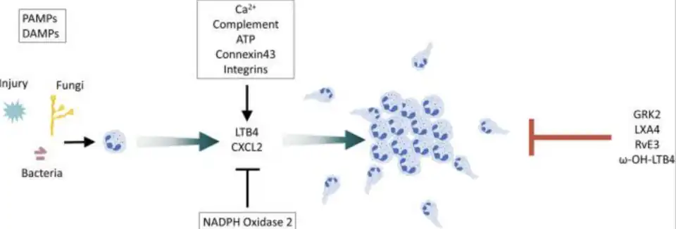 In the figure above, we see that at the start of neutrophil swarming, we begin with either an injury, fungi, or bacteria. As discussed above the PAMPs and the DAMPs trigger the initial neutrophil swarming. Then the LTB4 and CXCL2, which are chemoattractants, that are there to further the signals that cause a cascade of intracellular reactions to the disruptions and foreign substances. These begin a process known as swarm aggregation where the bacterial or other substances begin to all congregate together into one massive "ball" of bacteria, as shown above after the second green arrow. Another part of the image includes the box above the LTB4 and CXCL2, including Calcium, complement, ATP, Connexin 43, and Integrins. These also contribute to the chemoattractants by amplifying their signal and causing the swarm aggregation to run more forwardly. However, below is the NADPH Oxidase 2 or NOX2 is a negative regulator of the chemoattractants that may disrupt the events from proceeding forward. These events previously show how neutrophil swarming begins while the steps ahead are going to explain the ending of this process once the body no longer needs this to occur for its health and well-being, if the bacteria fungi or injury has resolved. The most crucial step in terminating the neutrophil swarming is when GPCR kinase 2 or GRK2 has phosphorylated or desensitized the GPCRs (G-protein coupled receptors). Then the other three, Lipoxin A4, resolving E3, and w-OH-LTB4 assist the GRK2 in stopping this process fully.[13]