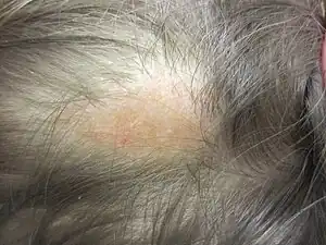 Nevus sebaceus or sebaceous nevus (the first term is its Latin name, the second term is its name in English; also known as an "organoid nevus"[1]: 661 and "nevus sebaceus of Jadassohn"[2]: 773 ) is a congenital, hairless plaque that typically occurs on the face or scalp.[3] Such nevi are classified as epidermal nevi and can be present at birth, or early childhood, and affect males and females of all races equally.[4] The condition is named for an overgrowth of sebaceous glands, a relatively uncommon hamartoma, in the area of the nevus. NSJ is first described by Josef Jadassohn in 1895.[5]