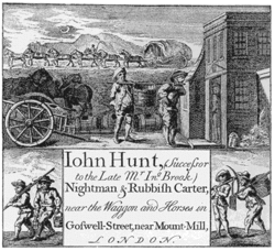 Disposal has varied through time. In urban areas, before deep drainage, a night soil collector usually arrived during the night, hence its name. The vehicle used for collection has been called a night-cart, and its operator a night-man or night-cart man.[3]