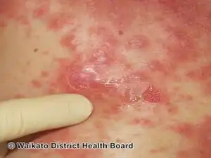 Nikolsky's sign is a sign in the skin, in which the top layer of skin comes off by applying pressure to intact skin in a person with a blistering skin disease such as pemphigus, staphylococcal scalded skin syndrome and toxic epidermal necrolysis.[1][2]