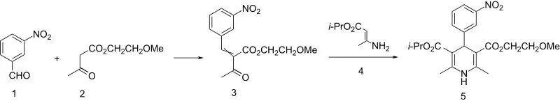 The key acetoacetate (2) for the synthesis of nimodipine (5) is obtained by alkylation of sodium acetoacetate with 2-methoxyethyl chloride, Aldol condensation of meta-nitrobenzene (1) and the subsequent reaction of the intermediate with enamine (4) gives nimodipine.