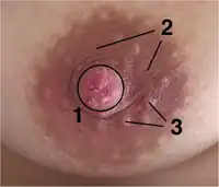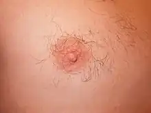 The nipple is a raised region of tissue on the surface of the breast from which, in females, milk leaves the breast through the lactiferous ducts to breastfeed an infant.[1][2] The milk can flow through the nipple passively or it can be ejected by smooth muscle contractions that occur along with the ductal system. Male mammals also have nipples but without the same level of function, and often surrounded by body hair.