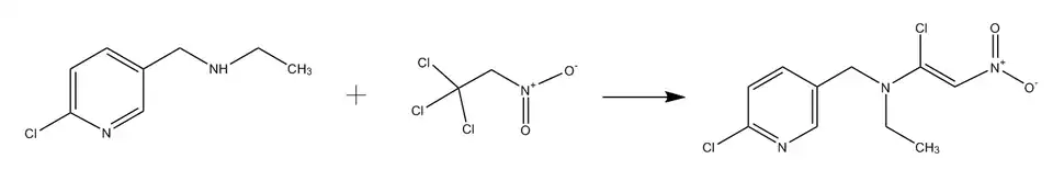 Synthesis can then proceed with a condensation reaction (step 2), adding the solvents dichloromethane and trichloronitromethane will yield the intermediate N-ethyl-2-chloro-5-pyridylmethyl amine with an additional nitroethylene group.
