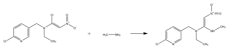 In the last step methylamine is added and reacts with the intermediate, replacing the pharmacophore chloride group, obtaining nitenpyram as the final end product.