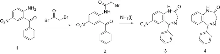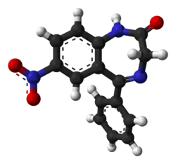 - ↑ Sternbach LH, Fryer RI, Keller O, Metlesics W, Sach G, Steiger N (May 1963). "Quinazolines and 1,4-Benzodiazepines. X. Nitro-Substituted 5-Phenyl-1,4-Benzodiazepine Derivatives". Journal of Medicinal Chemistry. 6 (3): 261–265. doi:10.1021/jm00339a010. PMID 14185980.