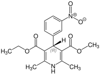 Nitrendipine contains a stereocenter and can exist as either of two enantiomers. The pharmaceutical drug is a racemate, an equal mixture of (R)- and the (S)-forms.[6]