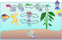 Nitrobacter play an important role in the nitrogen cycle by oxidizing nitrite into nitrate in soil and marine systems.[2] Unlike plants, where electron transfer in photosynthesis provides the energy for carbon fixation, Nitrobacter uses energy from the oxidation of nitrite ions, NO2−, into nitrate ions, NO3−, to fulfill their energy needs. Nitrobacter fix carbon dioxide via the Calvin cycle for their carbon requirements.[1] Nitrobacter belongs to the Alphaproteobacteria class of the Pseudomonadota.[3][4]