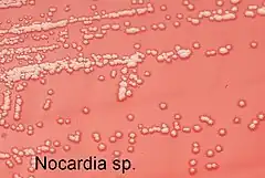 Nocardia is a genus of weakly staining Gram-positive, catalase-positive, rod-shaped bacteria. It forms partially acid-fast beaded branching filaments (acting as fungi, but being truly bacteria). It contains a total of 85 species. Some species are nonpathogenic, while others are responsible for nocardiosis.[1] Nocardia species are found worldwide in soil rich in organic matter. In addition, they are oral microflora found in healthy gingiva, as well as periodontal pockets. Most Nocardia infections are acquired by inhalation of the bacteria or through traumatic introduction.
