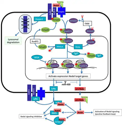 The Nodal family of proteins, a subset of the transforming growth factor beta (TGFβ) superfamily, is responsible for mesoendoderm induction, patterning of the nervous system, and determination of dorsal- ventral axis in vertebrate embryos. Activation of the Nodal pathway involves nodal binding to activin and activin-like receptors which leads to phosphorylation of the Smad2. The P-Smad2/Smad4 complex translocates into the nucleus to interact with transcription factors such as FoxH1, p53 and Mixer (Xenopus mix-like endodermal regulator). This will, in turn, lead to induction of target genes such as NODAL, Lefty, the antagonist of nodal cerberus, and others.[2]