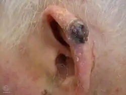 Nodular melanoma (NM) is the most aggressive form of melanoma.[1] It tends to grow more rapidly in thickness (vertically penetrate the skin) than in diameter compared to other melanoma subtypes.[2] Instead of arising from a pre-existing mole, it may appear in a spot where a lesion did not previously exist. Since NM tends to grow in depth more quickly than it does in width, and can occur in a place that did not have a previous lesion, the prognosis is often worse because it takes longer for a person to be aware of the changes.