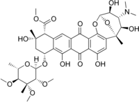 Nogalamycin is an anthracycline antibiotic produced by the soil bacteria Streptomyces nogalater. It has antitumor properties but it is also highly cardiotoxic. The less cardiotoxic semisynthetic analog menogaril was developed in the 1970s. Currently nogalamycin and menogaril are not used clinically.[1]