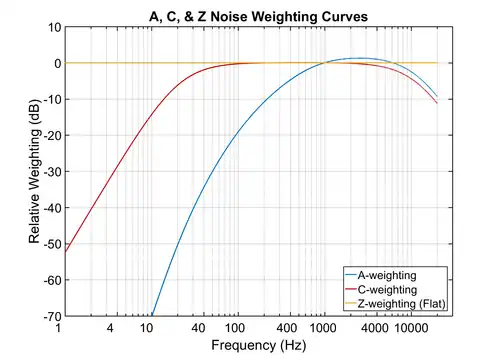 Researchers use different weights to account for noise frequency with intensity, as humans do not perceive sound at the same loudness level.[12] The most commonly used weighted levels are A-weighting, C-weighting, and Z-weighting. A-weighting mirrors the range of hearing, with frequencies of 20 Hz to 20,000 Hz.[12] This gives more weight to higher frequencies and less weight to lower frequencies.[12][17] C-weighting has been used to measure peak sound pressure or impulse noise, similar to loud short-lived noises from machinery in occupational settings.[17][18] Z-weighting, also known as zero-weighting, represents noise levels without any frequency weights.[17][18]