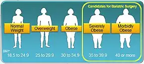 - ↑ Livhits M, Mercado C, Yermilov I, Parikh JA, Dutson E, Mehran A, et al. (2008). "Does weight loss immediately before bariatric surgery improve outcomes: a systematic review". Surgery for Obesity and Related Diseases. 5 (6): 713–21. doi:10.1016/j.soard.2009.08.014. PMID 19879814.