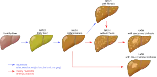 An abnormal accumulation of fat in the liver in the absence of secondary causes of fatty liver, such as significant alcohol use, viral hepatitis, or medications that can induce fatty liver characterizes non-alcoholic fatty liver disease (NAFLD).[8] The term NAFLD encompasses a continuum of liver abnormalities, from non-alcoholic fatty liver (NAFL, simple steatosis) to non-alcoholic steatohepatitis (NASH). These diseases begin with fatty accumulation in the liver (hepatic steatosis). A liver can remain fatty without disturbing liver function (NAFL), but by various mechanisms and possible insults to the liver, it may also progress into non-alcoholic steatohepatitis (NASH), a state in which steatosis is combined with inflammation and sometimes fibrosis (steatohepatitis). NASH can then lead to complications such as cirrhosis and hepatocellular carcinoma.[7][9][15]