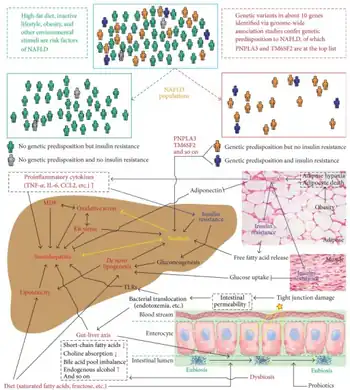 - ↑ 35.0 35.1 35.2 Leung C, Rivera L, Furness JB, Angus PW (July 2016). "The role of the gut microbiota in NAFLD". Nature Reviews. Gastroenterology & Hepatology. 13 (7): 412–25. doi:10.1038/nrgastro.2016.85. PMID 27273168.