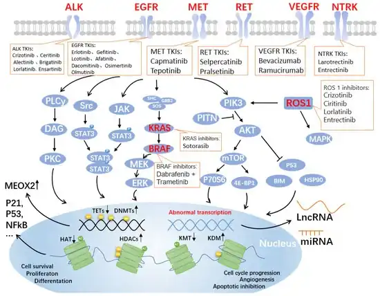 - ↑ Wu, Jiajia; Lin, Zhenghong (1 December 2022). "Non-Small Cell Lung Cancer Targeted Therapy: Drugs and Mechanisms of Drug Resistance". International Journal of Molecular Sciences. 23 (23): 15056. doi:10.3390/ijms232315056. ISSN 1422-0067.