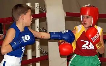 Two children boxing, the one on the right having a nosebleed due to a punch to the face.
