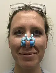 Traditional gauze packing has been replaced with products such as Merocel and the Rapid Rhino.[20] The Merocel nasal tampon is similar to gauze packing except it is a foam polymer which expands in the nose and provides a less hospitable medium for bacteria.[4] The Rapid Rhino stops nosebleeds using a balloon catheter, which has a cuff that is inflated by air to stop bleeding through extra pressure in the nasal cavity.[20] Reviews have found the efficacy is similar between the two; however, the Rapid Rhino has been shown to have greater ease of insertion and reduced discomfort.[20] People who receive nasal packing need to return in 24–72 hours in order to have packing removed.[4][3] There are also several dissolvable packing materials that stop bleeding through use of thrombotic agents that promote blood clots, such as surgicel.[4] The thrombogenic foams and gels do not require removal and dissolve after a few days.