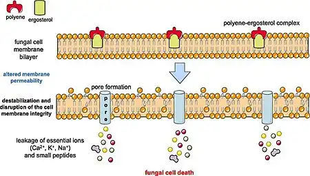 It binds to ergosterol, a major component of the fungal cell membrane. When present in sufficient concentrations, it forms pores in the membrane that lead to K+ leakage, acidification, and death of the fungus.[23]