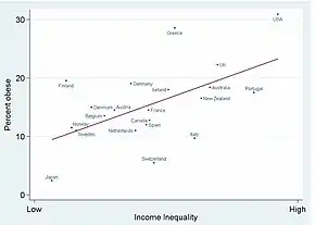 The correlation between social class and BMI varies globally. A review in 1989 found that in developed countries women of a high social class were less likely to be obese. No significant differences were seen among men of different social classes. In the developing world, women, men, and children from high social classes had greater rates of obesity.[139] An update of this review carried out in 2007 found the same relationships, but they were weaker. The decrease in strength of correlation was felt to be due to the effects of globalization.[140] Among developed countries, levels of adult obesity, and percentage of teenage children who are overweight, are correlated with income inequality. A similar relationship is seen among US states: more adults, even in higher social classes, are obese in more unequal states.[141]