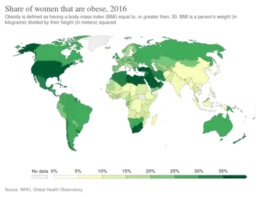 - ↑ Hales CM, Carroll MD, Fryar CD, Ogden CL (October 2017). "Prevalence of Obesity Among Adults and Youth: United States, 2015–2016". NCHS Data Brief (288): 1–8. PMID 29155689.