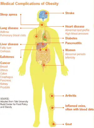 - ↑ 7.0 7.1 Malnick, S. D. H.; Knobler, H. (2006-09-01). "The medical complications of obesity". QJM. 99 (9): 565–579. doi:10.1093/qjmed/hcl085. ISSN 1460-2725. PMID 16916862.