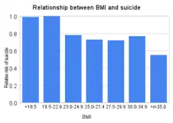 - ↑ 50.0 50.1 Mukamal KJ, Rimm EB, Kawachi I, O'Reilly EJ, Calle EE, Miller M (November 2009). "Body Mass Index and Risk of Suicide Among One Million US Adults". Epidemiology. 21 (1): 82–6. doi:10.1097/EDE.0b013e3181c1fa2d. PMID 19907331. S2CID 10646644.