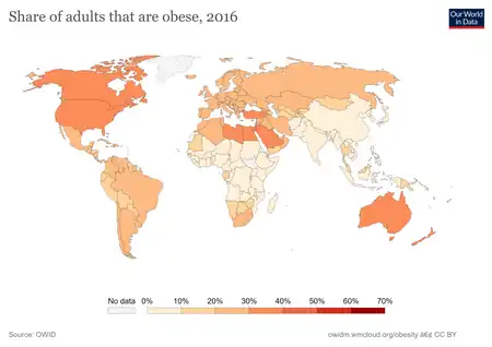 As of 2016, 1.9 billion adults (aged 18 years or older) were classified as being overweight, and within these adults, 650 million were classified as obese.[7] This translates to 39% of adults (39% of men and 40% of women) being overweight and 13% of the adult population worldwide (11% of men and 15% of women) being obese in 2016.